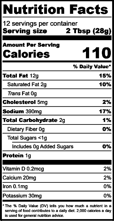 Mayonnaise (soybean oil, water, corn syrup, egg yolks, distilled and cider vinegar, salt, mustard seed, and calcium disodium EDTA), buttermilk (cultured milk, nonfat milk, salt and vitamin D3), seasoning blend (salt, monosodium glutamate, maltodextrin, dehydrated garlic, spices [including mustard], dehydrated onion and carrageenan gum [carrageenan and dextrose] and rice concentrate), glucona delta lactone, water, modified food starch, lactic acid, phosphoric acid, sodium benzoate, potassium sorbate and xanthan gum.