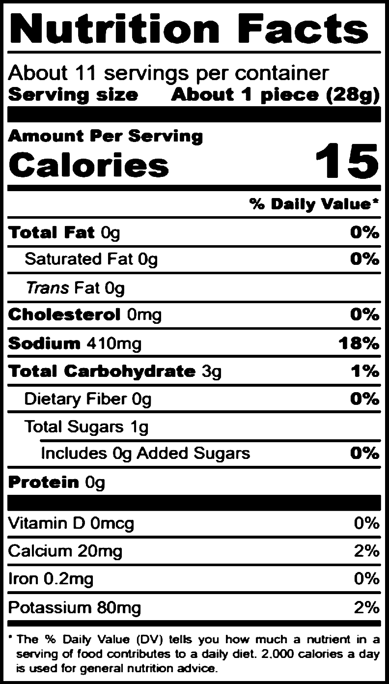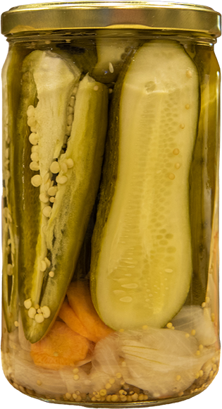 Ingredients: Cucumbers, vinegar, water, carrots, onions, garlic, jalapeno peppers, salt, spices and calcium chloride.