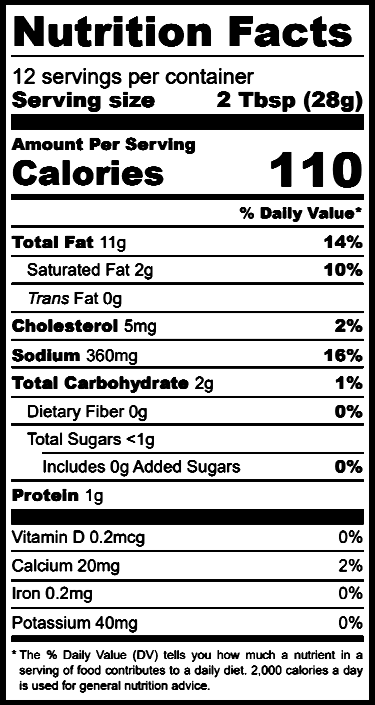 Ingredients: Mayonnaise (soybean oil, water, corn syrup, egg yolks, distilled and cider vinegar, salt, mustard seed, and calcium disodium EDTA), buttermilk (cultured milk, nonfat milk, salt and vitamin D3), seasoning blend (salt, monosodium glutamate, maltodextrin, dehydrated garlic, spices [including mustard], dehydrated onion and carrageenan gum [carrageenan and dextrose] and rice concentrate), spices, modified food starch, glucona delta lactone, water, dehydrated garlic, dehydrated onion, lactic acid, sodium benzoate, potassium sorbate and xanthan gum.